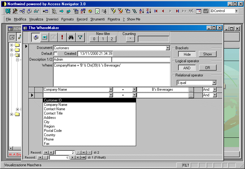 Una sola parola: COMPLETEZZA. Non importa quanto sia complessa la condizione da definire, The WhereMaker è in grado di rappresentarla: Il campo CompanyName deve essere uguale a "B's Beverages" E il campo City deve appartenere all'insieme {'New York','Los Angeles','San Diego'} nessun problema. Un dettaglio da non trascurare è che sebbene la condizione venga costruita usando i nomi dei campi, nella combobox da cui essi vengono scelti, l'utente vede le corrispondenti caption (nell'esempio il nome del campo è CompanyName ma l'utente vede nel combobox "Company Name"). Prima di applicare la condizione come filtro o come criterio di ricerca è possibile farsi dire quanti records la soddisfano (Counting). Grazie ai tre pulsanti "Nuovo filtro/New filter" 0,1,2 è possibile creare nuovi filtri: 0 - crea un nuovo filtro con 0 espressioni. 1 - crea un nuovo filtro con una espressione per ogni campo (in AND o in OR) in base agli operatori logico e relazionali impostati. 2 - crea un filtro di tipo Between su tutti i campi, riconducendolo a una serie di coppie di (fi >= vlj) AND cfi <=.vhj)